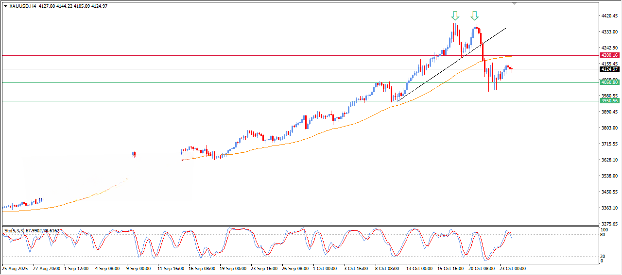 مقاومتها: اولین سطح مقاومت در ۴۲۱۸ دلار (بالاترین قیمت ۱۵ اکتبر) است. اگر قیمت بتواند از این سطح عبور کند، هدف بعدی ۴۳۳۰ دلار (بالاترین قیمت ۱۶ اکتبر) خواهد بود. در صورت ادامه حرکت صعودی، مقاومت بعدی در محدوده بالایی باند بولینگر در ۴۳۶۵ دلار قرار دارد.