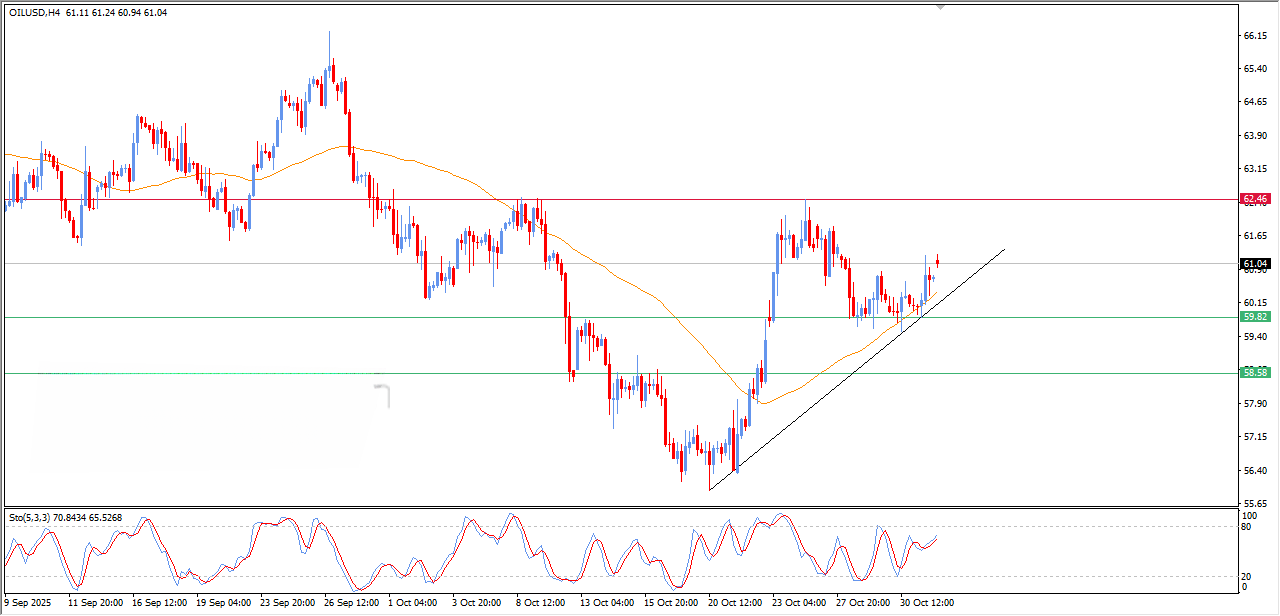 • اهداف بعدی: قیمت می‌تواند برای تست مقاومت اصلی در $۶۲.۵۰ و در صورت شکست آن، به سمت $۶۳.۰۰ حرکت کند. این سناریو با تشدید تنش‌های ژئوپلیتیکی نیز تقویت می‌شود.