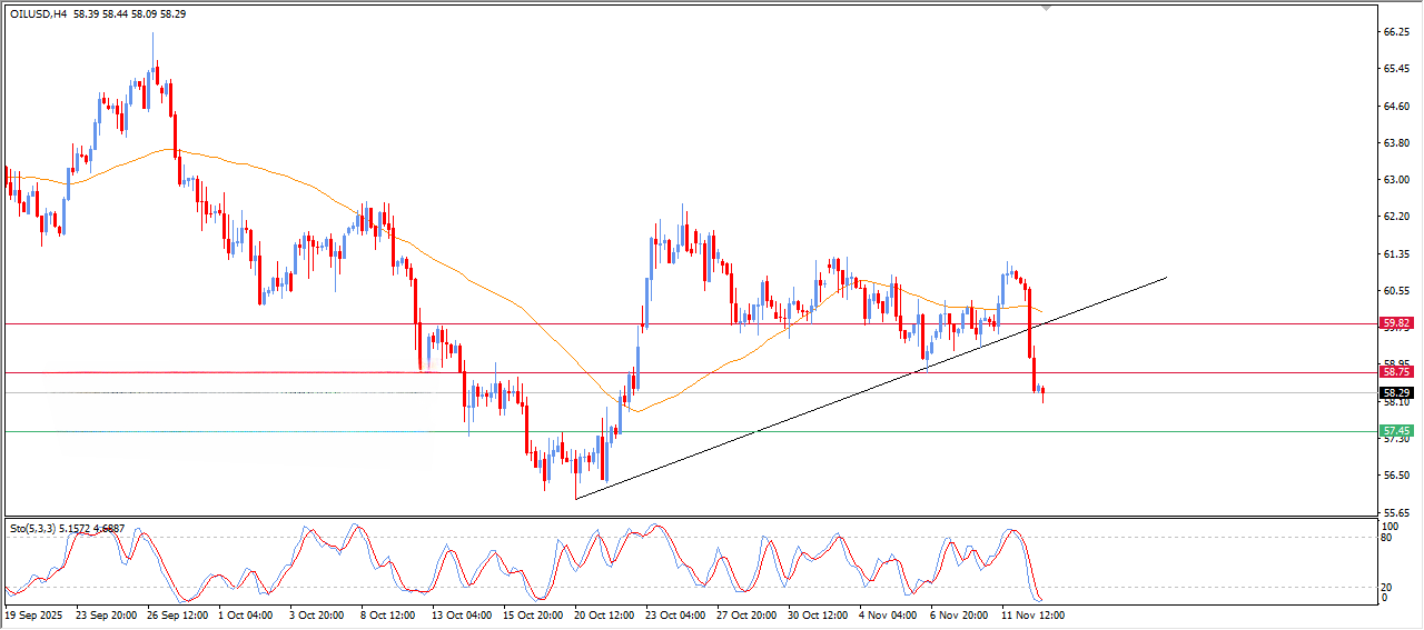 قیمت نفت خام آمریکا (WTI) در بازه معاملاتی توکیو روز پنج‌شنبه، در حدود ۵۸.۵۰ دلار معامله می‌شود. این رشد جزئی پس از آن رخ داد که دونالد ترامپ لایحه پایان دادن به طولانی‌ترین تعطیلی دولت آمریکا را امضا کرد.