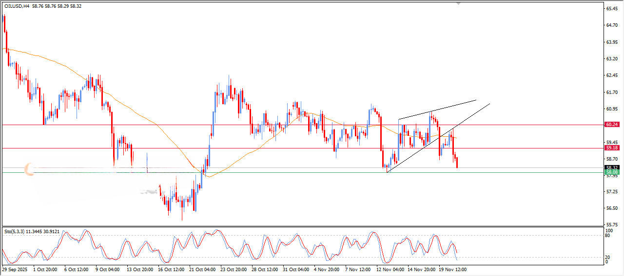 • در تایم فریم 4 ساعته، قیمت نفت WTI در حال حاضر در نزدیکی سطح 58 دلار قرار دارد و شاهد حرکت نزولی در روزهای گذشته بوده‌ایم. اگر قیمت همچنان زیر این سطح باقی بماند، احتمال ادامه روند نزولی وجود دارد.