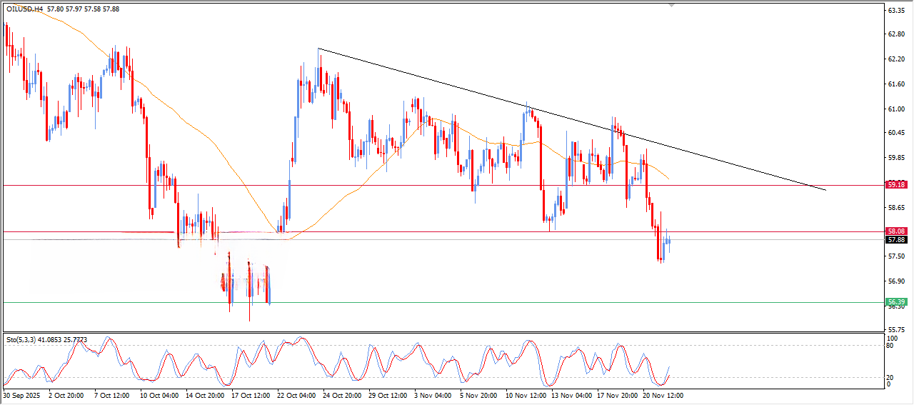 در حال حاضر نفت خام WTI در محدودهی 57.85 دلار معامله میشود و نمودار چهارساعته نشان میدهد که قیمت در یک محدودهی فشرده میان حمایت 57.20 و مقاومت 58.50 گرفتار شده است. حرکت قیمت در روزهای اخیر بیشتر حالت اصلاحی و بدون قدرت صعودی مشخص داشته و شیب روند کوتاهمدت کمی رو به پایین است. تا زمانیکه قیمت زیر مقاومت 58.50 قرار دارد، فشار فروش در بازار باقی میماند و احتمال دارد قیمت دوباره به سمت حمایت 57.20 حرکت کند. اگر این حمایت شکسته شود، ساختار نزولی تقویت میشود و مسیر برای ریزش بیشتر تا محدودههای 56.50 و حتی 55.80 دلار باز خواهد شد.
