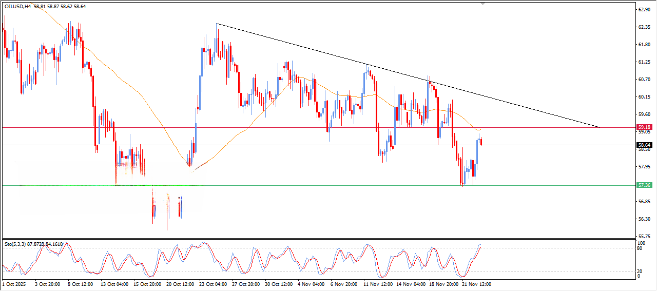 • حمایت اول: قیمت WTI در نزدیکی سطح ۵۸.۰۰ دلار قرار دارد که ممکن است به‌عنوان حمایت اولیه عمل کند. اگر قیمت به زیر این سطح حرکت کند، حمایت بعدی در ۵۷.۵۰ دلار قرار دارد.