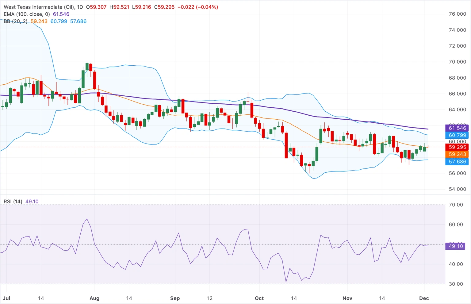 در نمودار روزانه، نفت WTI با قیمت ۵۹.۲۹ دلار معامله می‌شود.