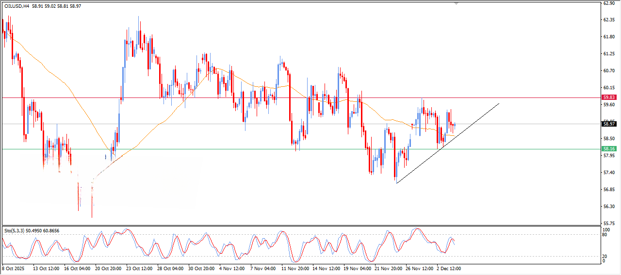 59.50 دلار: اولین سطح مقاومتی که در صورت شکست میتواند حرکت بعدی قیمت به سمت 60.00 دلار را تسهیل کند.