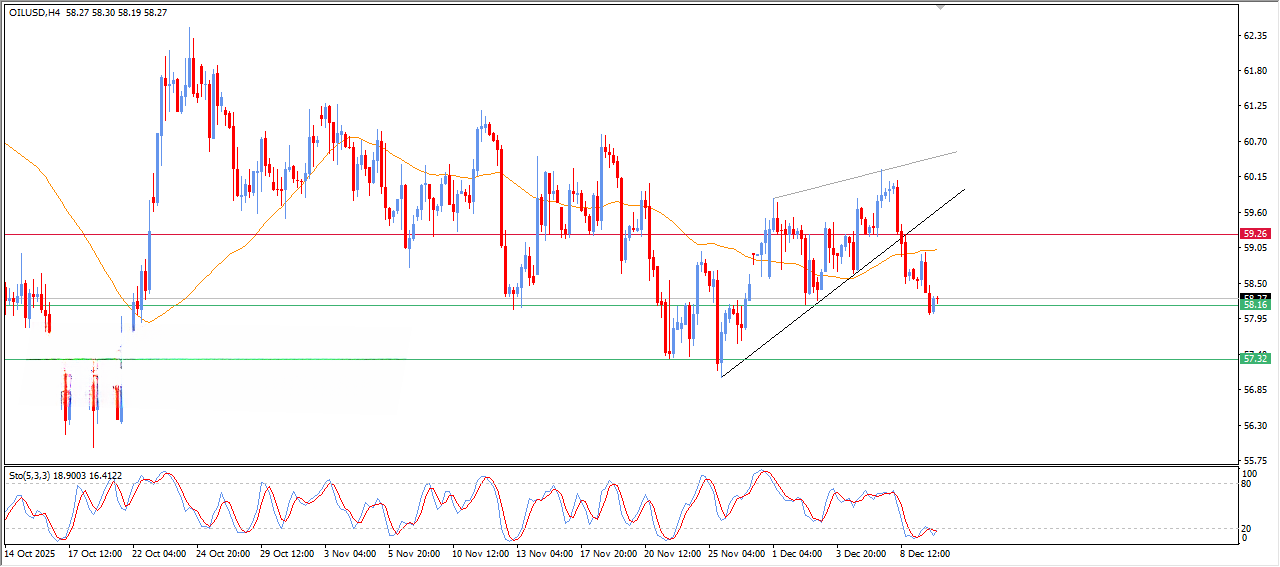 اگر قیمت WTI بالاتر از سطح مقاومت اول (۵۹.۰۰ دلار) تثبیت شود، احتمال افزایش بیشتر قیمت به سمت مقاومت دوم (۶۰.۵۰ دلار) وجود دارد.