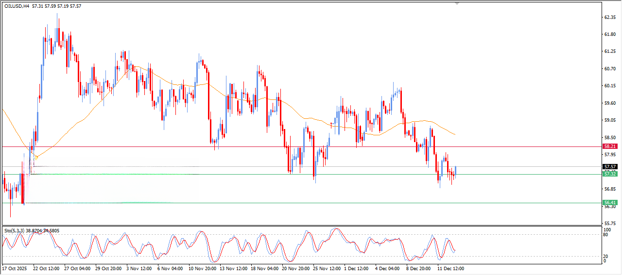 سناریوی نزولی (Bearish): اگر اخبار صلح اوکراین جدیتر شود و دلار تقویت گردد، شکست سطح حمایتی ۵۷.۰۰ دلار محتمل است. در این صورت، هدف بعدی فروشندگان منطقه ۵۶.۵۰ دلار و سپس ۵۵.۰۰ دلار خواهد بود.