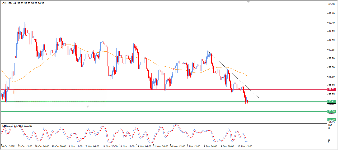 • سناریوی نزولی (Bearish): سناریوی نزولی با شکست و تثبیت قیمت زیر حمایت حیاتی ۵۶.۰۰ دلار فعال می‌شود. این حرکت با پیشرفت قطعی مذاکرات صلح اوکراین یا افزایش غیرمنتظره ذخایر نفت API تقویت شده و راه را برای رسیدن قیمت به ۵۵.۰۰ دلار باز می‌کند.