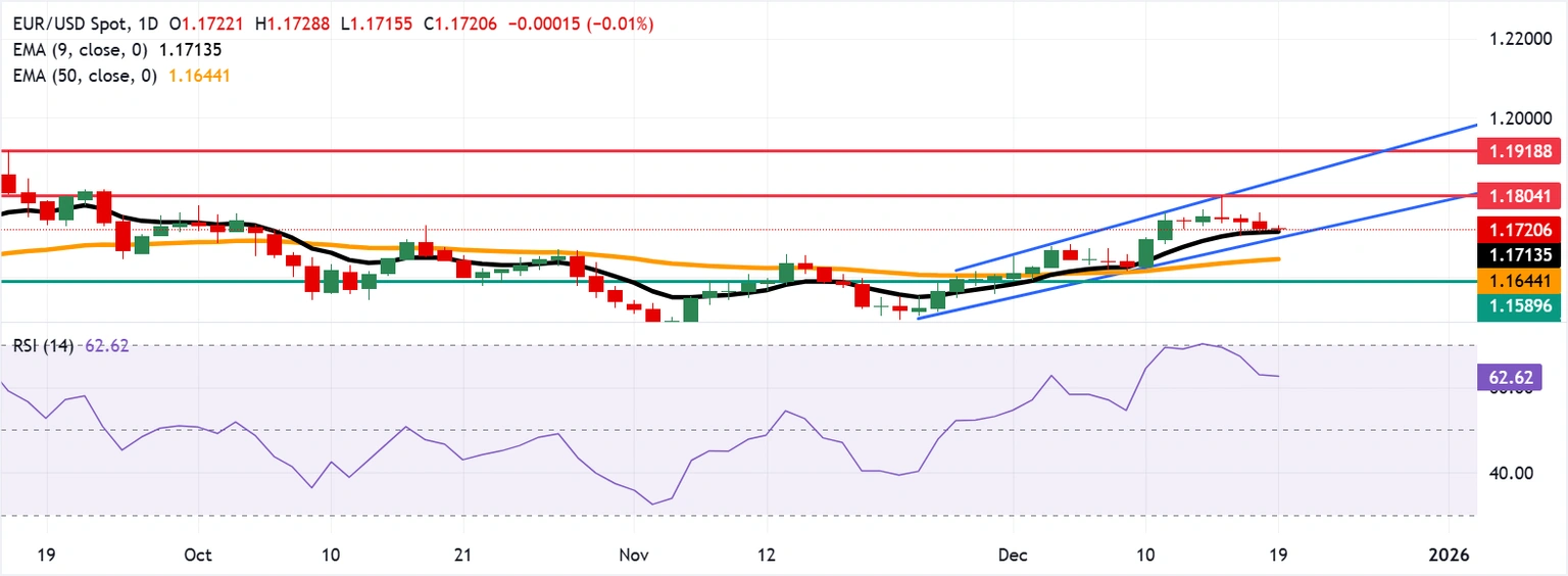 جفت ارز برای چهارمین جلسه متوالی ضعیفتر است و در حوالی 1.1720 در بازه معاملاتی توکیو جمعه معامله میشود. با این حال، تحلیل تکنیکال نشاندهنده تمایل صعودی است، زیرا این جفتارز همچنان در داخل الگوی کانال صعودی قرار دارد. اندیکاتور RSI (شاخص قدرت نسبی) برای 14 روز در سطح 62.11 قرار دارد که نشاندهنده قدرت مثبت است، بدون اینکه فشار خرید افراطی مشاهده شود. این نشان میدهد که هنوز روند صعودی قوی است. همچنین جفتارز EUR/USD بالاتر از میانگینهای متحرک نمایی (EMA) 9 روزه و 50 روزه قرار دارد، که به معنای حفظ تمایل صعودی است. مادامی که قیمت بالای این میانگینها باقی بماند، چشمانداز صعودی حفظ میشود. میانگین کوتاهمدت بالاتر از میانگین میانمدت قرار دارد که قدرت روند را تایید میکند. در صورت ادامه حرکت صعودی، این جفتارز میتواند به 1.1804، بالاترین سطح دو ماهه که در تاریخ 16 دسامبر ثبت شده، بازگردد. در صورتی که قیمت روزانه بالاتر از این سطح بسته شود، احتمال افزایش بیشتر به سمت مرز بالایی کانال صعودی نزدیک به 1.1850 وجود دارد. شکستن بالای این سطح میتواند قیمت را به ناحیه 1.1918 هدایت کند، که بالاترین سطح از ژوئن 2021 است. اگر قیمت کاهش یابد، سطح حمایت نزدیک به میانگین متحرک نمایی 9 روزه در 1.1713 قرار دارد و بعد از آن مرز پایینی کانال صعودی در 1.1700 است. در صورتی که این ناحیه حمایتی شکسته شود، احتمال کاهش بیشتر قیمت به میانگین متحرک 50 روزه در 1.1644 وجود دارد. شکستن این سطح میتواند قیمت را به سمت 1.1589 که کمترین سطح در سه هفته اخیر است، هدایت کند. تحلیل تکنیکال: سناریو صعودی: پشتیبانی از قیمت بالای EMAها (9 و 50 روزه) نشاندهنده روند صعودی است. هدف اول 1.1804 (بالاترین سطح دو ماهه) و سپس 1.1850 و 1.1918. RSI در سطح 62.11 به نشاندهنده روند مثبت بدون فشار خرید افراطی است، بنابراین امکان ادامه حرکت صعودی وجود دارد. سناریو نزولی: اگر قیمت به زیر 1.1713 (میانگین متحرک 9 روزه) برود، خطر کاهش بیشتر قیمت وجود دارد. حمایت بعدی در 1.1700 (مرز پایینی کانال صعودی) قرار دارد. شکست این سطح میتواند قیمت را به 1.1644 (میانگین متحرک 50 روزه) و سپس به 1.1589 (کمترین سطح در سه هفته اخیر) برساند. RSI زیر 50 میتواند سیگنالی از ضعف روند و فشار فروش باشد. سطوح حمایت و مقاومت: حمایت اول: 1.1713 (EMA 9 روزه) حمایت دوم: 1.1700 (مرز پایینی کانال صعودی) مقاومت اول: 1.1804 (بالاترین سطح دو ماهه) مقاومت دوم: 1.1850 (مرز بالایی کانال صعودی) مقاومت سوم: 1.1918 (بالاترین سطح از ژوئن 2021) اندیکاتور RSI: RSI بالای 50 نشاندهنده روند مثبت است و اگر به سطح 70 برسد، ممکن است نشانه فشار خرید بیش از حد باشد. RSI پایینتر از 50 سیگنال ضعف روند و فشار فروش است.