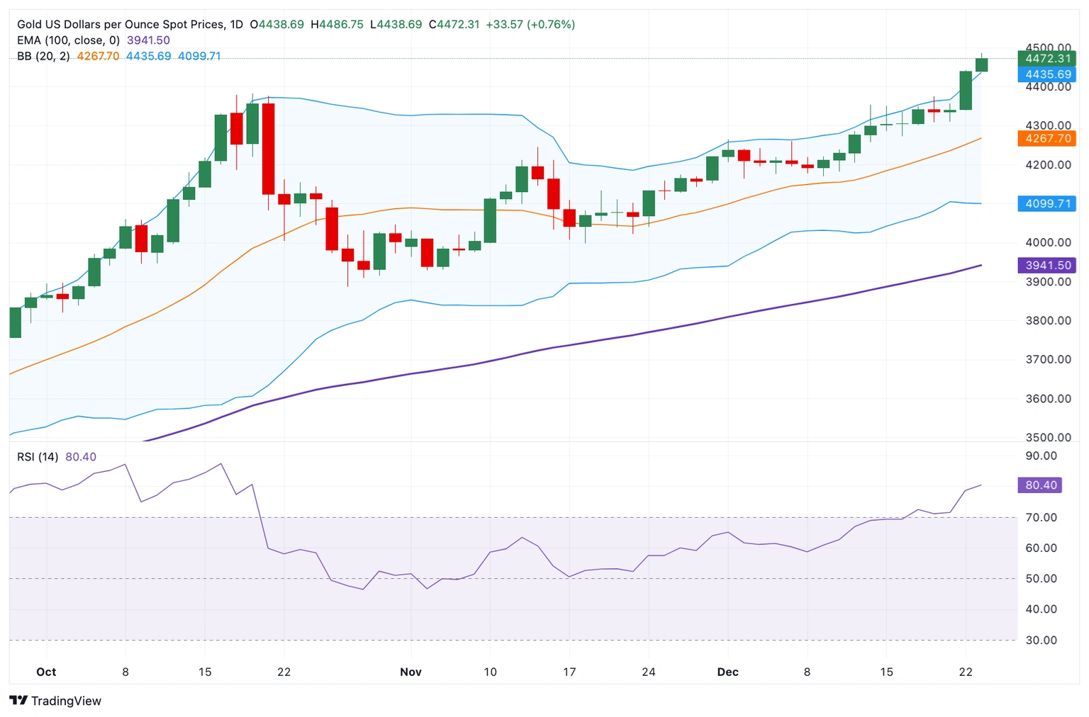 طبق نمودار روزانه، طلا همچنان در یک روند صعودی قدرتمند قرار دارد و قیمت به خوبی بالاتر از میانگین متحرک ۱۰۰ روزه حفظ شده است. باز شدن دهانه «باندهای بولینگر» نیز نشاندهنده شدت گرفتن این روند صعودی است.
