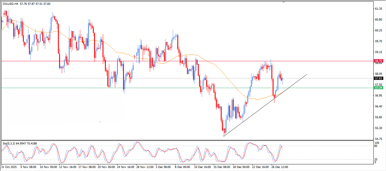 • در صورتی که قیمت بالاتر از 58.20 دلار بسته شود، احتمال ادامه روند صعودی و رسیدن به 60 دلار وجود دارد.