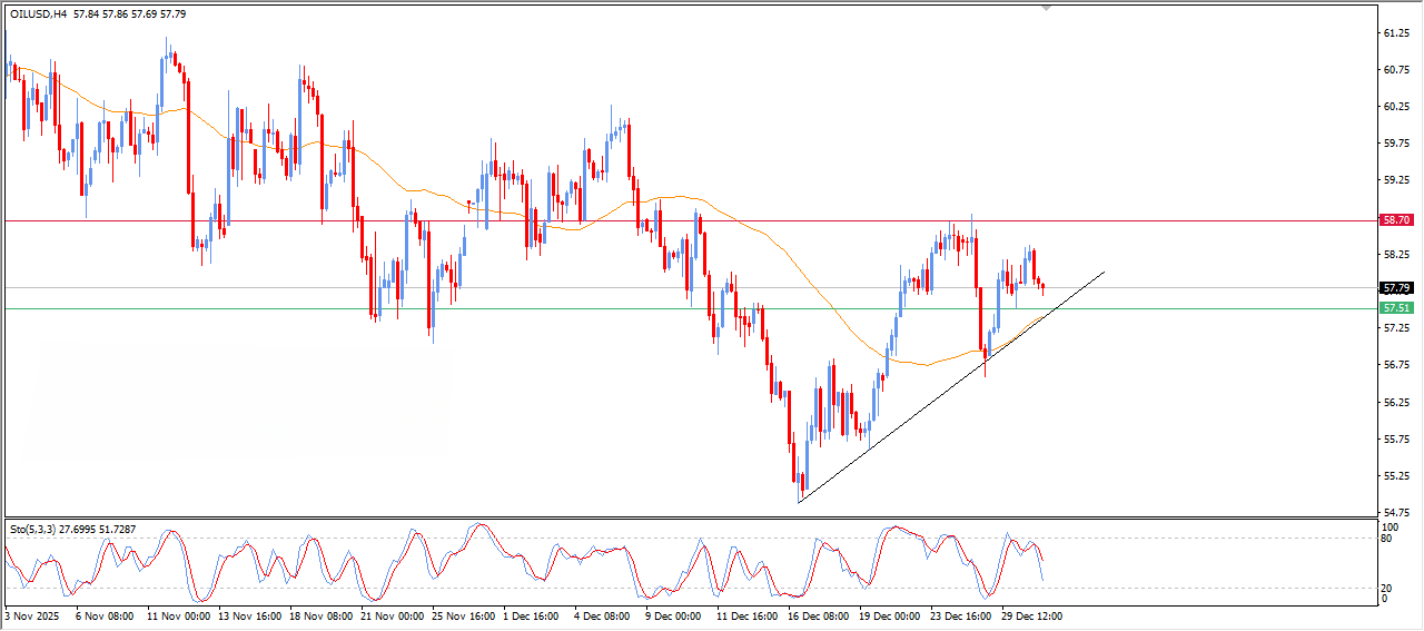 در صورت حفظ حمایت ۵۷.۰۰ دلار و شکست مقاومت ۵۸.۵۰ دلار،