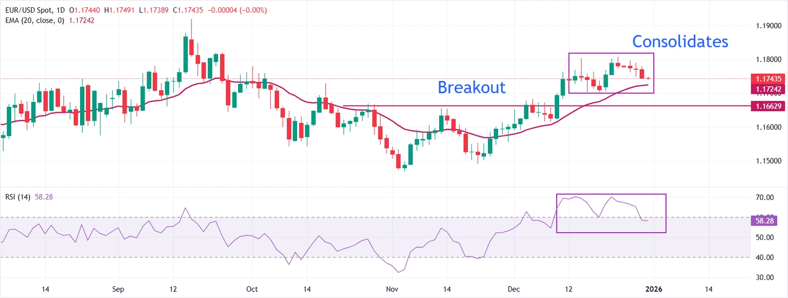 جفتارز (EUR/USD) در بازه معاملاتی توکیو روز چهارشنبه تا محدوده ۱.۱۷۴۰ ریزش یافت و به کف هفتگی خود رسید. این ریزش قیمت تحت فشار تقویت نسبی دلار آمریکا رخ داده است؛ آن هم با وجود اینکه صورتجلسه نشست ماه دسامبر کمیته بازار آزاد فدرال رزرو (FOMC) که روز سهشنبه منتشر شد، نشان میدهد اکثر سیاستگذاران فدرال رزرو همچنان بر لزوم کاهش بیشتر نرخ بهره تأکید دارند.