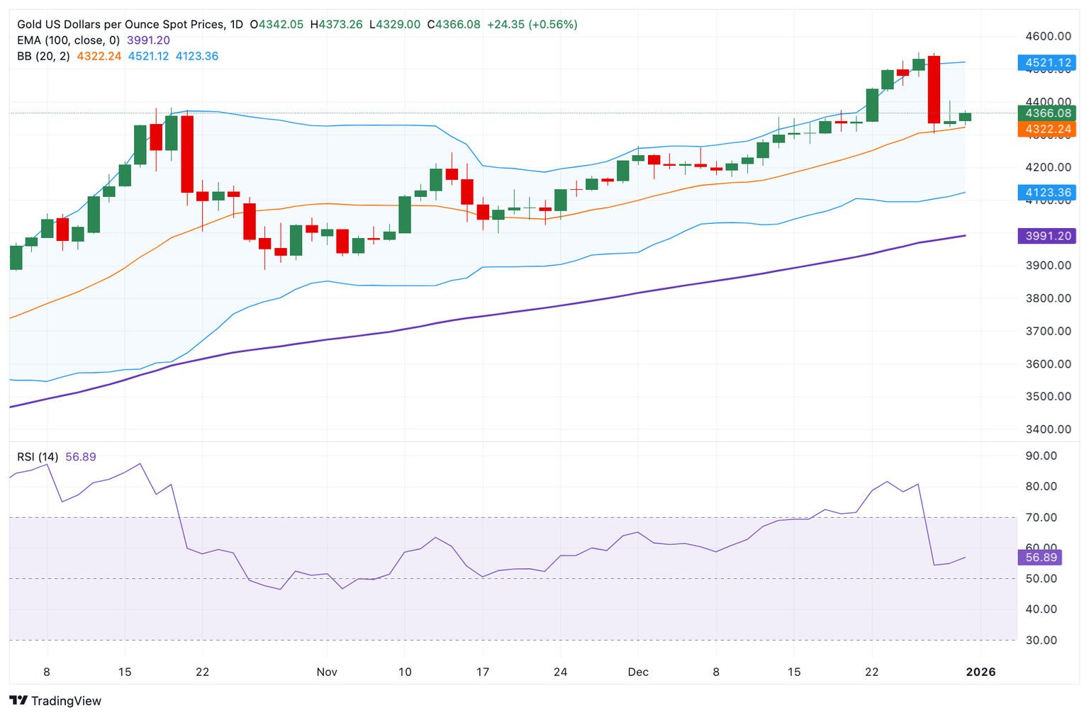 از سوی دیگر، اولین سطح حمایت برای طلا در ناحیه ۴,۳۰۵-۴,۳۰۰ دلار مشاهده می‌شود که نشان‌دهنده کف قیمت در ۲۹ دسامبر و همچنین یک رقم گرد است. اگر قیمت به طور قابل توجهی از این سطح پایین‌تر بیافتد، ممکن است فشار فروش قیمت را به سمت کف قبلی در ۴,۲۷۱ دلار در ۱۶ دسامبر بکشاند.