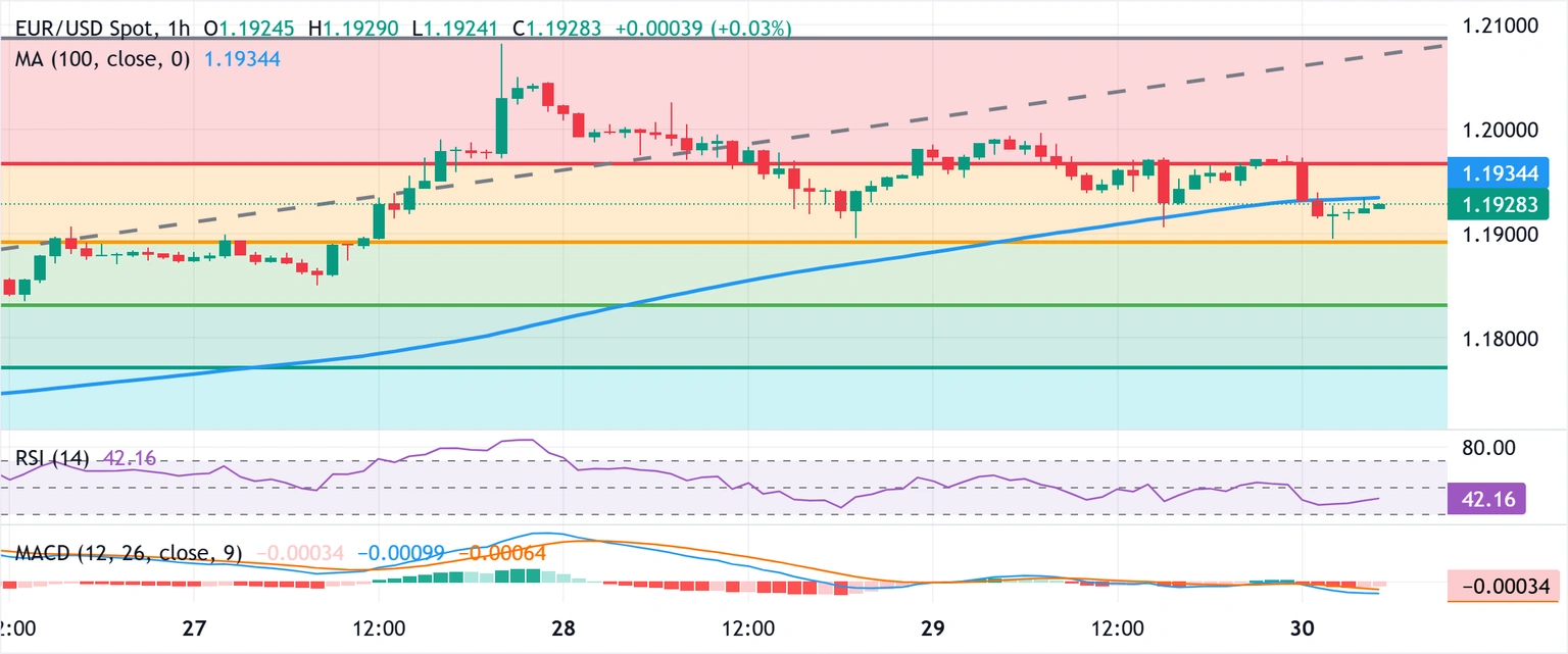 از نظر تکنیکال، ضعف درونروزی زیر میانگین متحرک ساده 100 ساعته (SMA) میتواند به عنوان یک محرک جدید برای فروشندگان EUR/USD در نظر گرفته شود. با این حال، قیمتها در زیر سطح 1.1900 مقاومتی نشان داده و از سطح اصلاح فیبوناچی 38.2% آخرین افزایش از پایینترین نقطه ماه گذشته که هفته گذشته ثبت شد، بازگشتند.