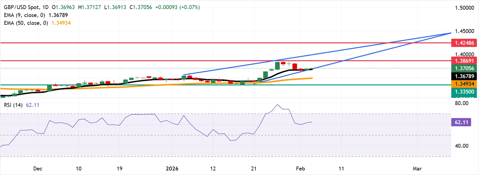 جفتارز پوند/دلار (GBP/USD) پس از ثبت سود مختصر در جلسه قبلی، در بازه معاملاتی توکیو روز چهارشنبه در حوالی 1.3700 ثابت باقی مانده است. تحلیل تکنیکال چارت روزانه نشان میدهد که احتمالاً یک برگشت نزولی در راه است، زیرا دامنه نوسان باریکتر شده و این نشاندهنده ضعیف شدن شتاب خرید در قالب یک الگوی مثلث صعودی است. میانگین متحرک نمایی (EMA) 9 روزه در سطح 1.3678 بالاتر از میانگین متحرک 50 روزه در سطح 1.3493 قرار دارد و قیمت بالاتر از هر دو میانگین حرکت میکند. هر دو میانگین به سمت بالا شیب دارند که نشاندهنده قدرت روند صعودی است. شاخص قدرت نسبی (RSI) 14 روزه در سطح 61.75 بالای خط میانه 50 قرار دارد و سیگنال خرید بیش از حد را نشان نمیدهد، که به معنای حفظ شتاب صعودی است. جفتارز GBP/USD ممکن است اولین مقاومت را در سطح 1.3869 پیدا کند، که بالاترین سطح از سپتامبر 2021 بوده و در تاریخ 27 ژانویه ثبت شده است. سپس، مرز بالایی الگوی مثلث صعودی در حدود 1.4010 قرار دارد. شکستن این الگو میتواند یک حرکت جدید به سمت بالا به سوی 1.4248 ایجاد کند، که بالاترین سطح از آوریل 2018 است. حمایت فوری در سطح 1.3678 از میانگین متحرک 9 روزه قرار دارد، که با مرز پایینی الگوی مثلث صعودی همراستا است. شکست زیر این سطح میتواند منجر به بروز تمایل نزولی شود و حمایت بعدی در سطح 1.3493 از میانگین متحرک 50 روزه، و پس از آن در ناحیه حمایت نزدیک به 1.3350 مشاهده شود.