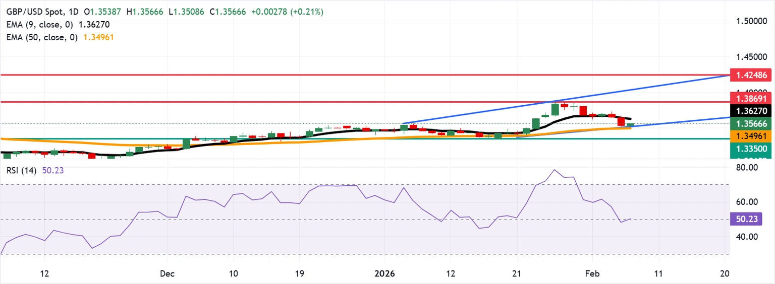 جفت ارز (GBP/USD) پس از دو روز افزایش قیمت، در یازه معاملاتی توکیو روز جمعه حدود 1.3560 معامله میشود. تحلیل تکنیکال نمودار روزانه نشاندهنده احتمال معکوس شدن روند نزولی است، چرا که قیمت نزدیک به مرز پایینتر یک الگوی کانال صعودی قرار دارد. اندیکاتور 14 روزه (RSI)، که یک اندیکاتور مومنتوم است، در سطح 50 قرار دارد که نشاندهنده وضعیت خنثی است. زمانی که RSI بالای 50 حرکت کند، حمایت بیشتری به نظر میرسد و اگر زیر 50 باشد، فشار فروش بیشتری وارد میشود. جفت ارز GBP/USD بالاتر از میانگین متحرک نمایی 50 روزه (EMA) در 1.3496 قرار دارد، در حالی که توسط میانگین متحرک 9 روزه در 1.3626 محدود شده است. میانگین کوتاهمدت در حال تغییر جهت است و این مانعی برای صعود بیشتر قیمت است، در حالی که شیب میانگین بلندمدت همچنان مثبت است. ساختار میانگینهای متحرک هنوز روند کلی را حمایت میکند، اما حرکت کوتاهمدت ضعیفتر شده و به سمت تثبیت قبل از ادامه حرکت جهتدار تمایل دارد. اولین سطح حمایت در مرز پایین کانال صعودی حدود 1.3520 قرار دارد، که پس از آن، میانگین متحرک 50 روزه در 1.3496 به عنوان حمایت بعدی عمل میکند. شکستن این سطح میتواند فشار نزولی بیشتری به جفت ارز پوند/دلار وارد کرده و آن را به سمت ناحیه بازگشت حمایتی در حدود 1.3350 سوق دهد. از سمت بالا، جفت ارز GBP/USD ممکن است به سمت میانگین متحرک 9 روزه در 1.3626 حرکت کند. بسته شدن روزانه بالاتر از این میانگین میتواند راه را برای حرکت به سمت مقاومت در 1.3869 هموار کند، که بالاترین سطح از سپتامبر 2021 است و در 27 ژانویه ثبت شد. حرکت بیشتر به بالا میتواند جفت ارز را به سمت مرز بالای کانال صعودی در حدود 1.4050 هدایت کند. شکستن این سطح میتواند مسیر صعود جدیدی به سوی 1.4248 باز کند، که بالاترین سطح از آوریل 2018 است.