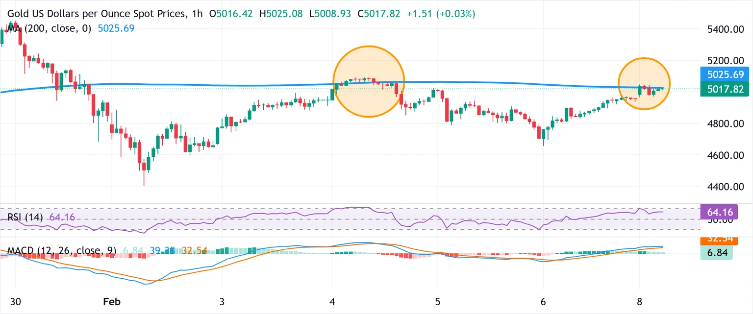 روند کلی: طلا همچنان در سطحهای بالاتر از 5000 دلار قرار دارد، اما با وجود عوامل حمایتی مختلف، هنوز نتوانسته از اوجهای هفته گذشته عبور کند.