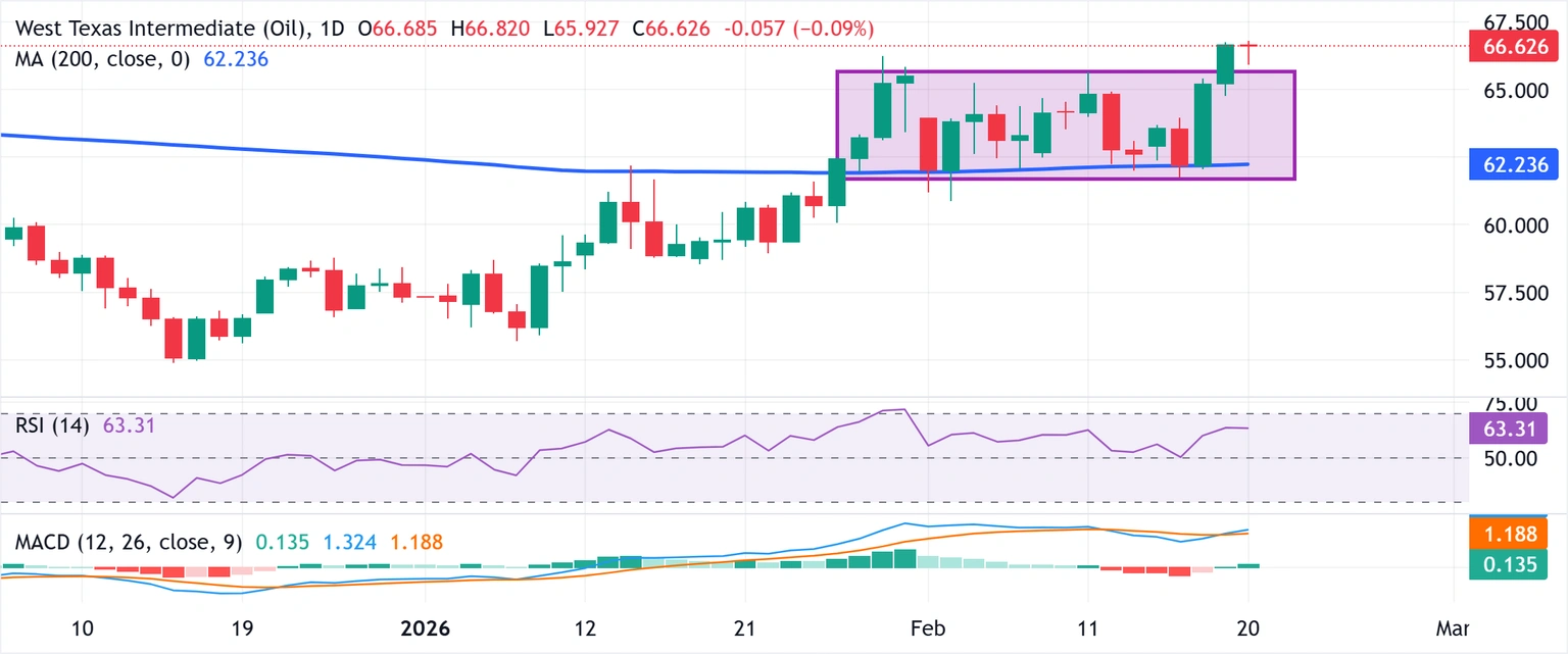 قیمت نفت خام آمریکا (WTI) پس از ریزش جزئی در بازه معاملاتی توکیو تا زیر ۶۶ دلار، دوباره افزایش یافت و به نزدیکی قله سطح خود از ۴ اوت رسید. این کالا در مسیر ثبت رشد هفتگی بیش از ۵ درصد قرار دارد و به نظر می‌رسد همچنان ظرفیت صعود بیشتر را داشته باشد؛ زیرا افزایش تنش‌ها میان آمریکا و ایران نگرانی‌ها درباره اختلال در عرضه نفت در خاورمیانه را تقویت کرده است.