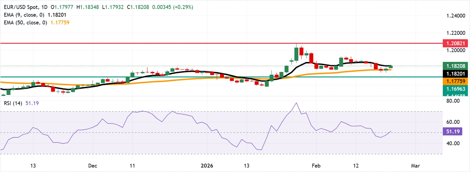 تحلیل تکنیکال نمودار روزانه نشان می‌دهد که جفت‌ارز EUR/USD بالاتر از میانگین متحرک نمایی 50 روزه (EMA) قرار دارد، که همچنان روند کلی صعودی را حمایت می‌کند. میانگین متحرک 9 روزه نیز در نزدیکی سطح فعلی قرار دارد و این موضوع باعث شده تا حرکت قوی‌تری در کوتاه‌مدت مشاهده نشود.